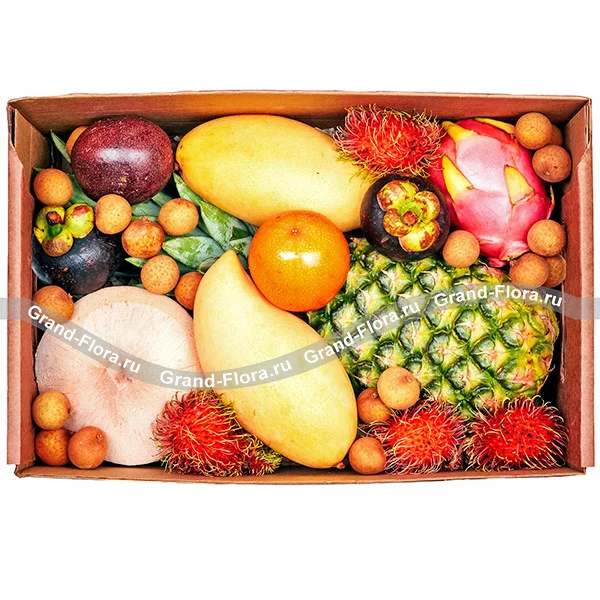 Коробка вкусного настроения и пользы в каждом ее сантиметре. Подарок, который станет эффектным сюрпризом по любому поводу. Коробка наполнена экзотическими фруктами: маракуйя, мангостин, гранадилла и многими другими, которые станут дополнением к праздничному обеду или пикнику.